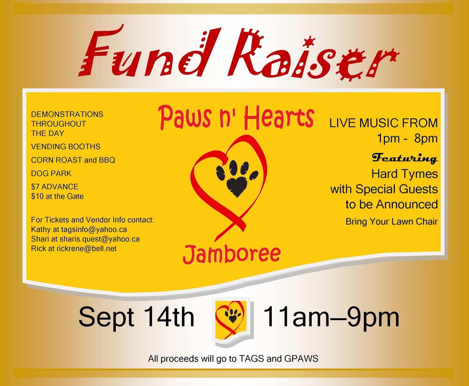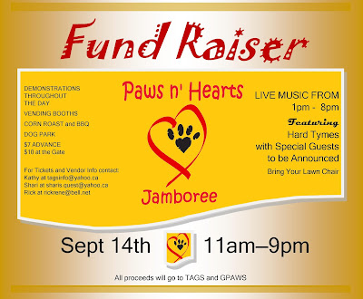 TAGS (The Animal Guardian Society) and Guardians Promoting Animal Wellness (GPAWS) are partners in hosting an outdoor fundraiser event next Saturday, September 14, 2013. 100% of the money raised from the event will go to animal rescue.